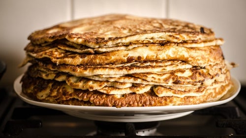 4. Vlijte čtvrtinu těsta na předehřátou pánev a vytvořte palačinku s průměrem zhruba 12,5 cm. Pokud chcete udělat palačinky trochu hustší, počkejte po nalití těsta 20 sekund a přilijte ještě trošku.