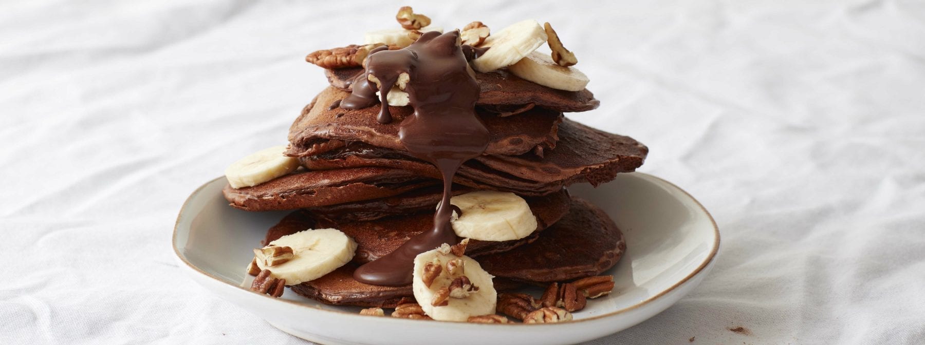 Banánovo-pekanové proteinové palačinky s hustou čokoládovou polevou