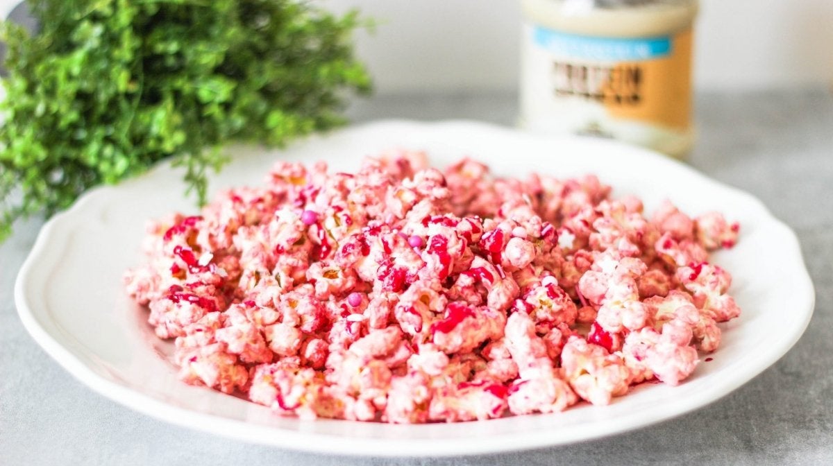 - Vzniklou růžovou směs dejte na popcorn a zamíchejte. Následně můžete přidat ještě půl odměrky proteinu. Pro extra "Barbie look" přidejte ještě polevu a růžový posyp.