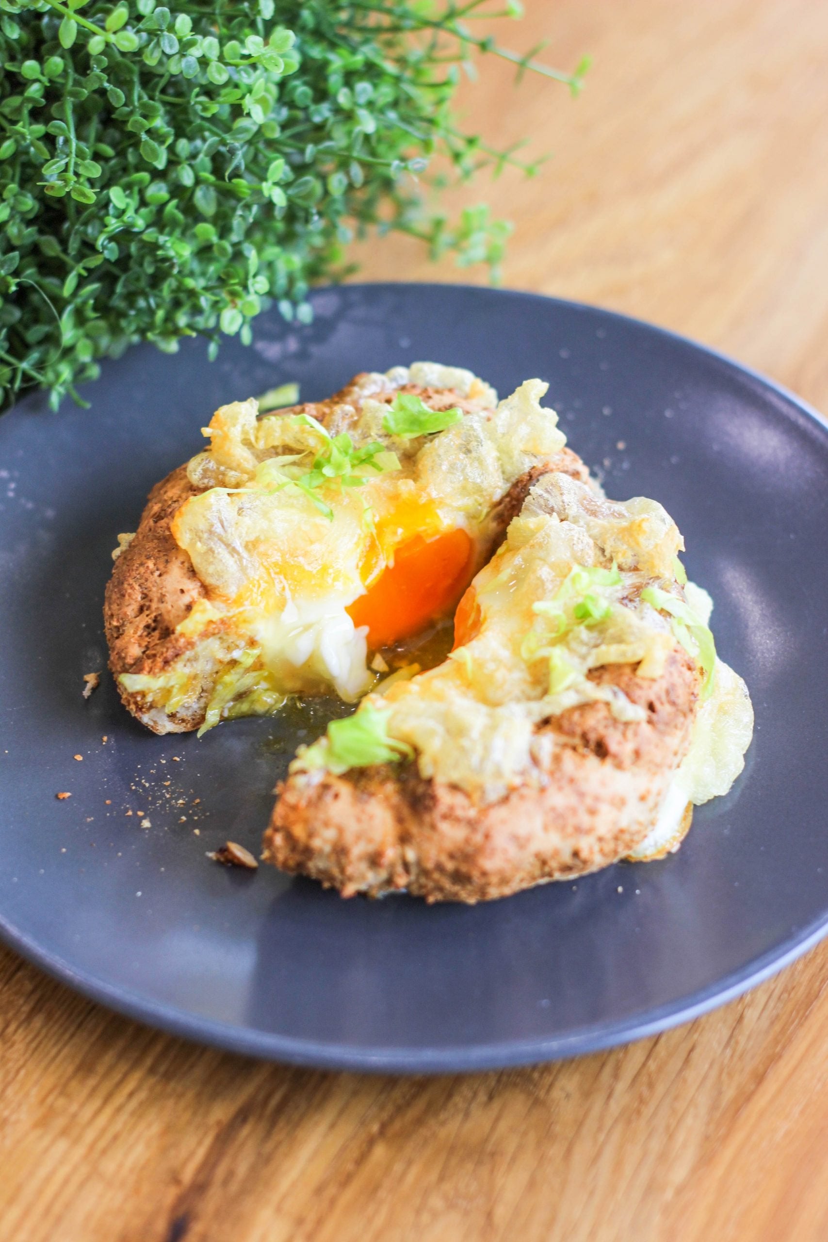 - Bagel dejte do horkovzdušné fritézy na 200°C / 10 min (nebo do trouby na o něco delší dobu), poté do bagelu rozklepněte vejce, přidejte tvarůžek (nebo jiný sýr) a dejte znova zapéct na 200°C na 5 min.