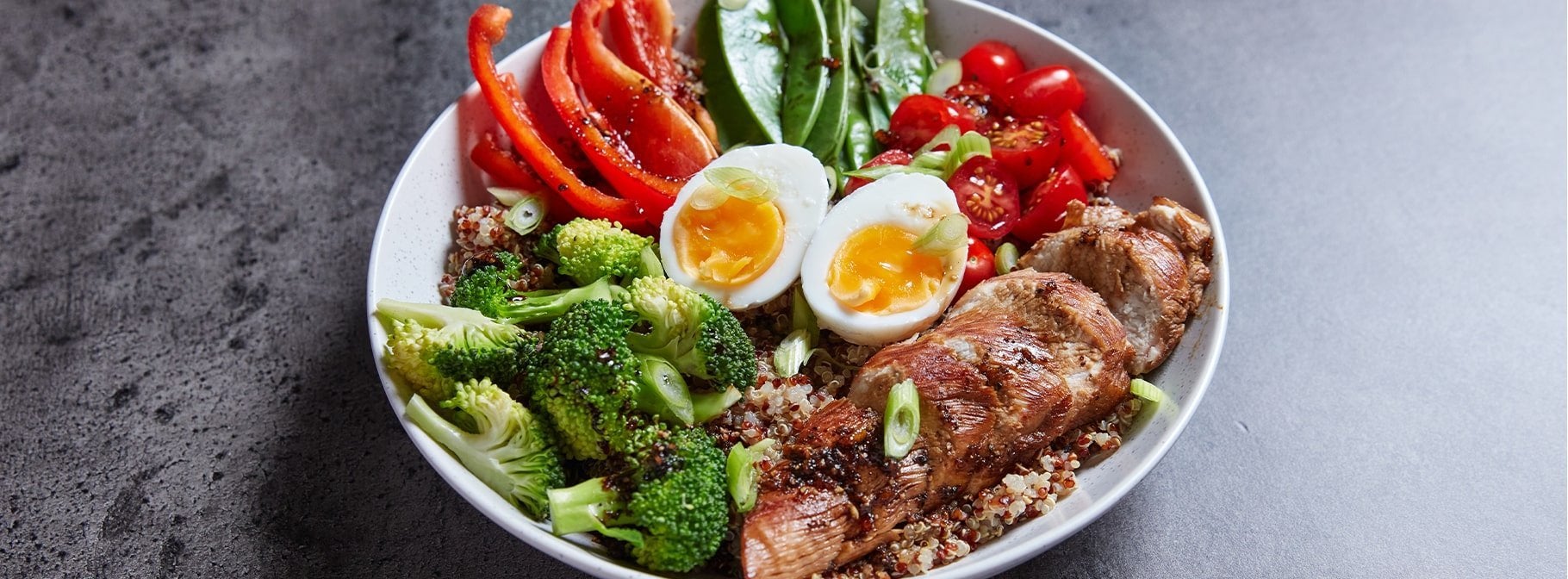 - Poskládejte si proteinovou misku. Udělejte základ z quinoy, přidejte uvařenou brokolici a hrachové lusky spolu s plátky červené papriky a cherry rajčátky. Přidejte nakrájené kuřecí prso a vařené vejce a poté přidejte zbytek marinády a posypte nasekanou jarní cibulkou.