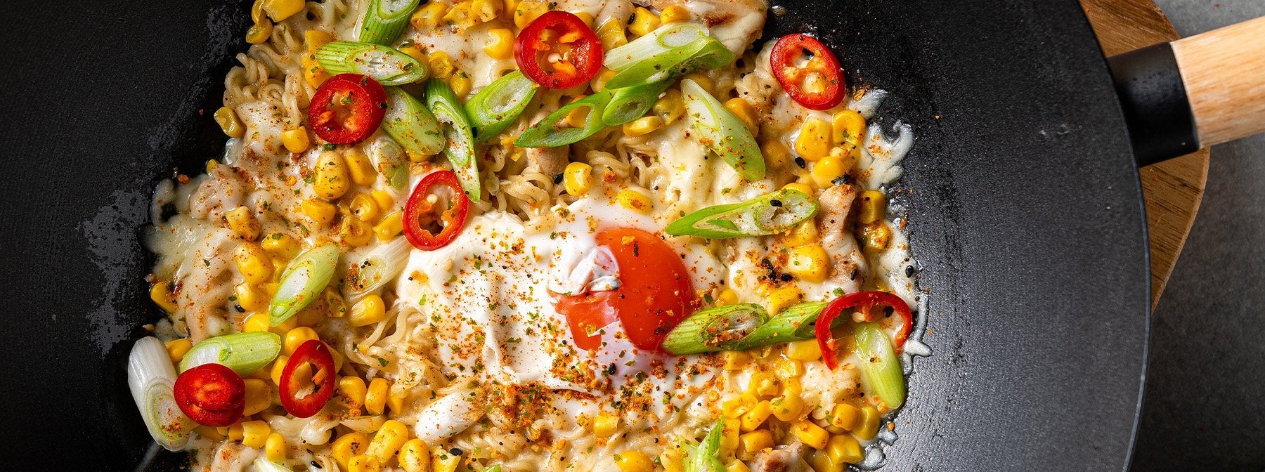 - Doprostřed nudlí rozklepněte vajíčko a posypte sýrem, nasekanou jarní cibulkou, kukuřicí a plátky chilli.