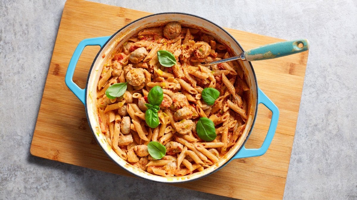 Hledáte nějaké zdravé recepty na těstoviny? Tyhle fit krémové těstoviny s párkem oživí váš meal prep.