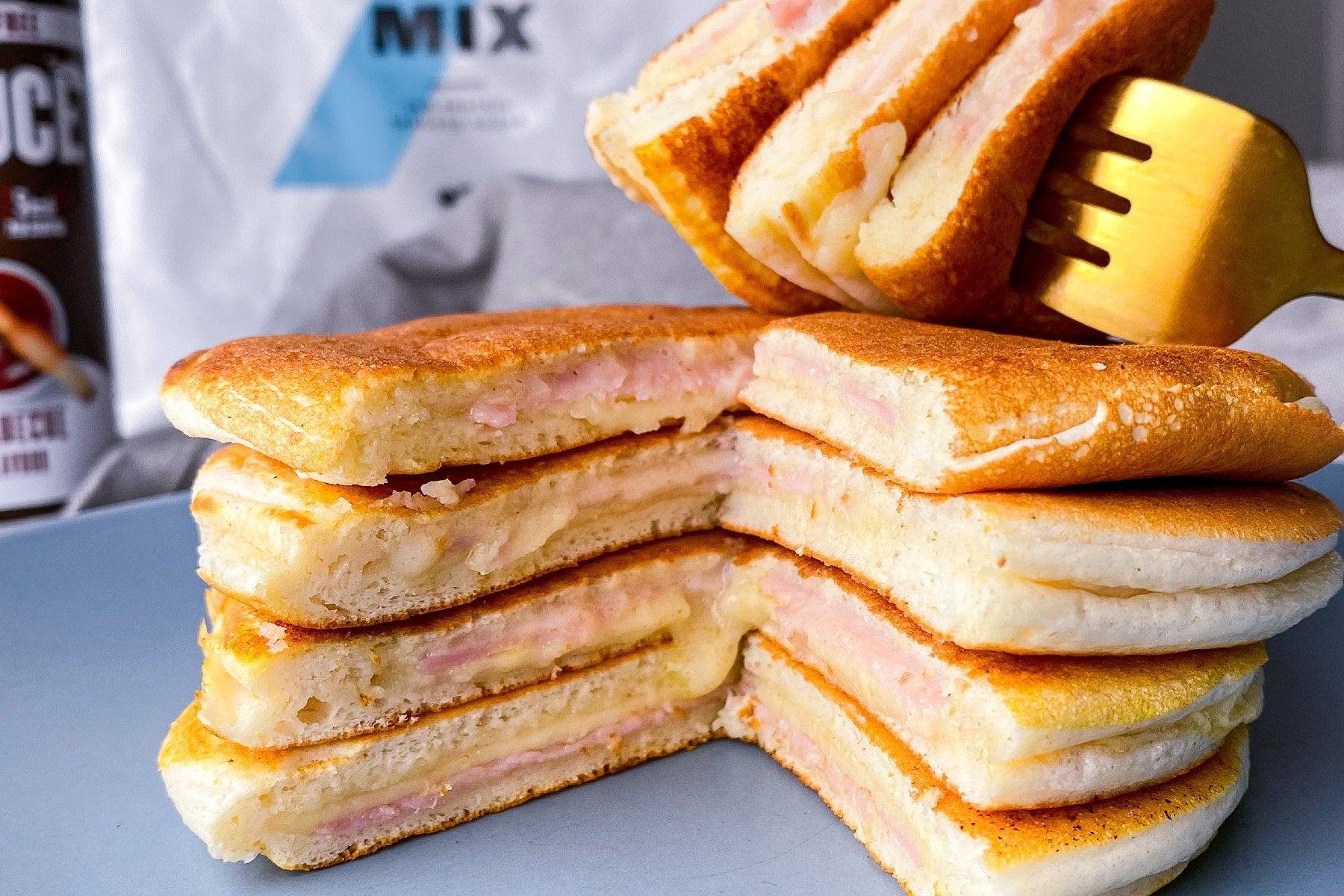 Do mísy dejte Proteinovou směs na palačinky a postupně přidávejte mléko. - Na předehřátou pánev dejte dvě lžíce těsta, dejte navrch plátek šunky a sýra a zakryjte další lžící palačinkové směsi. Opékejte 1-2 minuty a poté otočte.