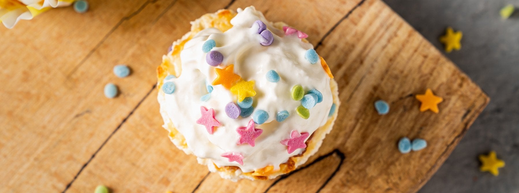 - Po upečení nechte pár minut zchladit a pak ozdobte šlehačkou a sypáním. Ihned si vychutnejte.