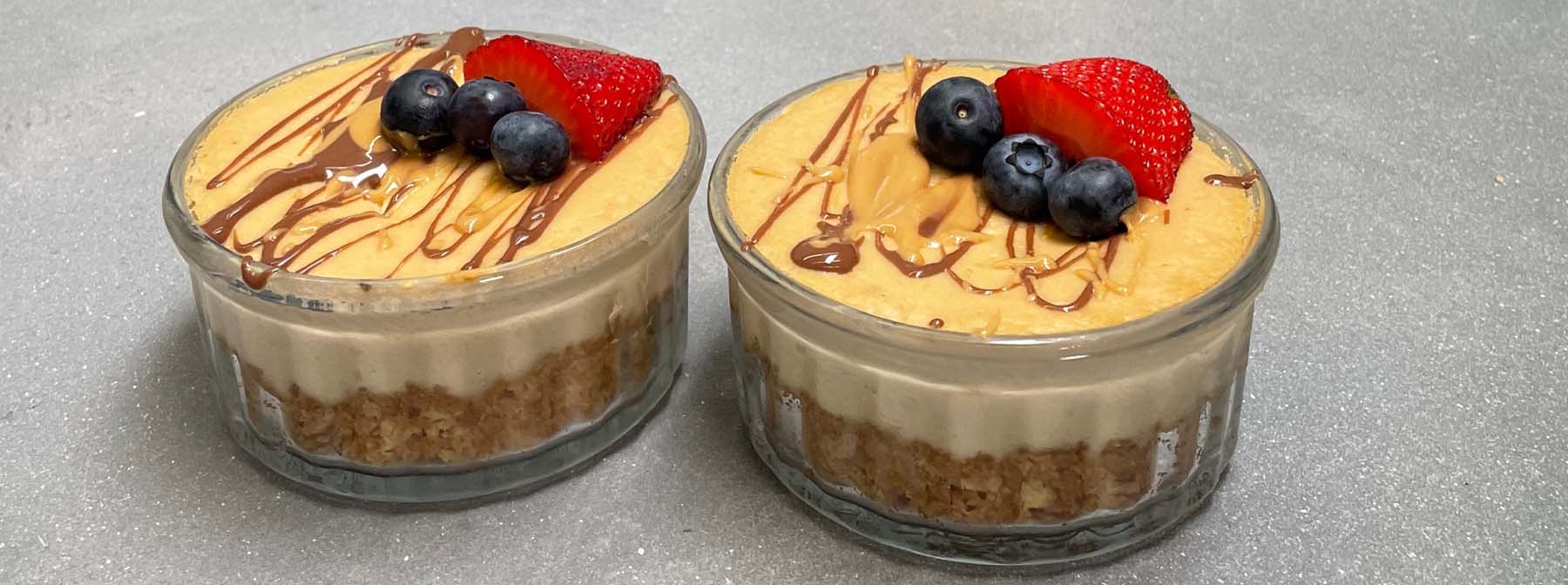 - Až budou cheesecaky úplně vychlazené, ozdobte podle chuti. Vypadají skvěle s trochou arašídového másla a proteinovou čokoládovou pomazánkou, jahodami a borůvkami.