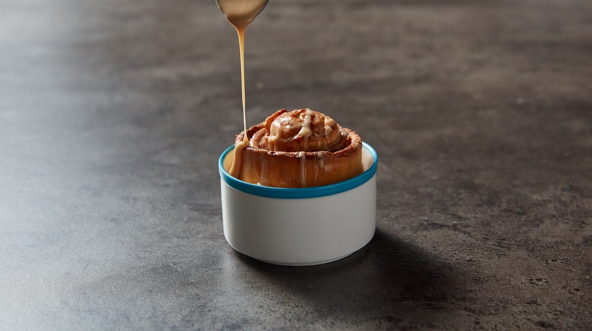 - Skořicovou rolku dejte do malé zapékací misky nebo hrníčku vhodného do trouby a pečte 15-20 minut, dokud nezezlátne a nebude zcela upečená.