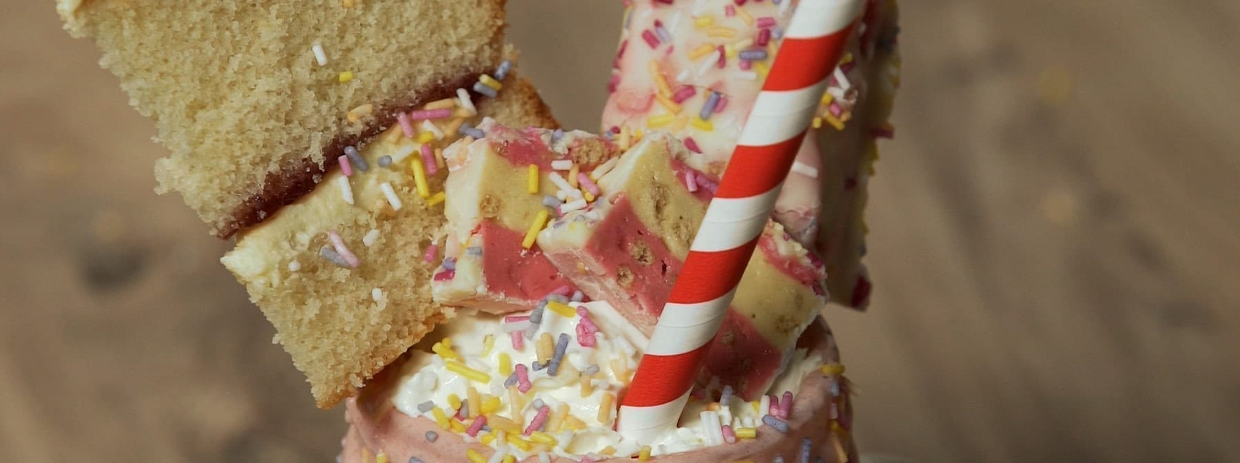 5. Vlijte koktejl do sklenice a ozdobte šlehačkou. Následně použijte dřevěné špejle pro upevnění kousku narozeninového dortu a druhé půlky 6vrstvé tyčinky.