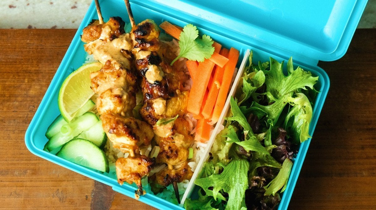 Dejte dohromady 4 krabičky na jídlo, do každé dejte 2 špízy společně s rýží a salátem, posypte koriandrem a přidejte limetku. V lednici vydrží 3-4 dny.