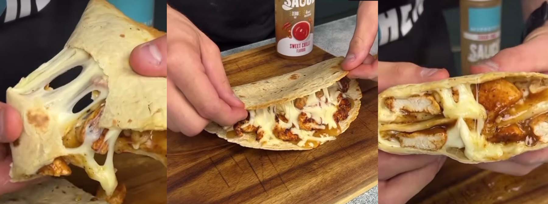 - Dejte kuřecí na jednu stranu tortilly, přidejte štědrou porci Omáčky bez cukru v příchuti sweet chilli a posypte nastrouhaným sýrem.