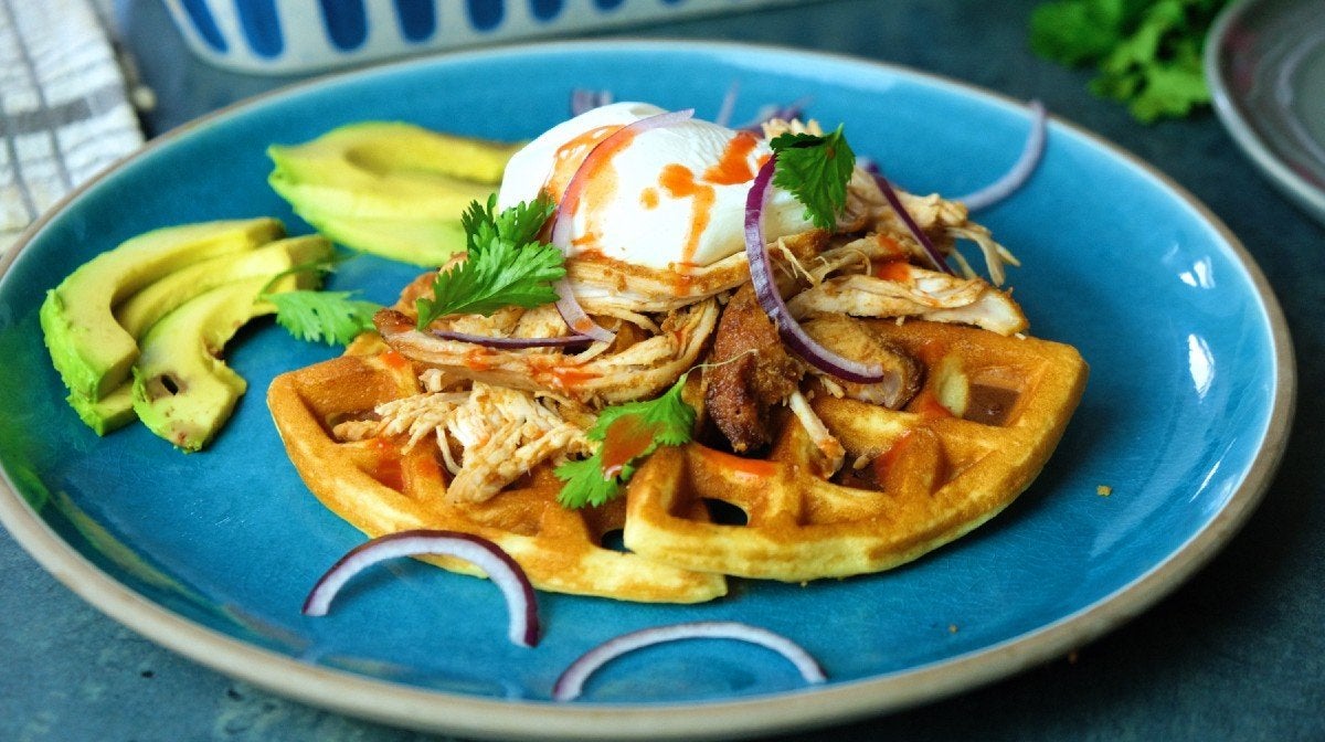 - Až budete podávat, dejte na talíř vafle, poté trhané kuře, ztracené vejce a avokádo jako přílohu. Posypte plátky červené cibule, koriandrem a ostrou omáčkou. Tomu se říká pořádná snídaně.