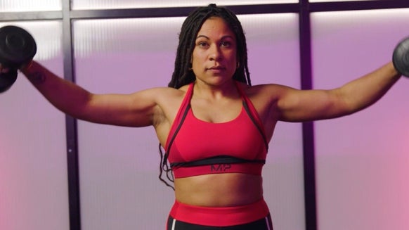 - Vytlačte činky nahoru a vytočte je tak, abyste je měli v plochém úchopu s palci směřujícími k sobě. Zachovejte pevný střed těla a rovná záda, lopatky směřují dozadu.