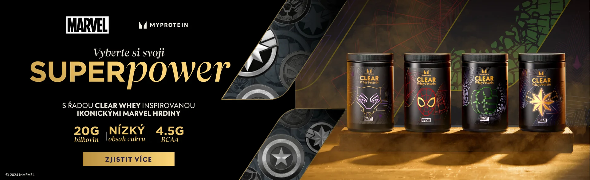 Vyberte si Spider-Man, Hulk, BlackPanther nebo Captain MARVEL Clear Whey Protein, abyste podpořili své cíle. Každý koktejl vám dodá 20g bílkovin a méně než 90 kcal.